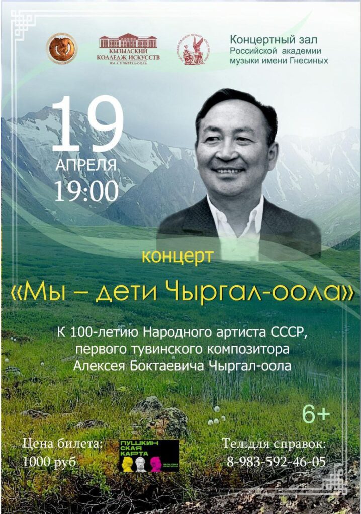 19 апреля, 19:00 ч. на сцене концертного зала РАМ им. Гнесиных состоится выступление Кызылского колледжа искусств им. А. Б. Чыргал-оола «МЫ-ДЕТИ ЧЫРГАЛ-ООЛА», посвященный 100 — летию первого тувинского композитора Алексея Боктаевича Чыргал-оола.