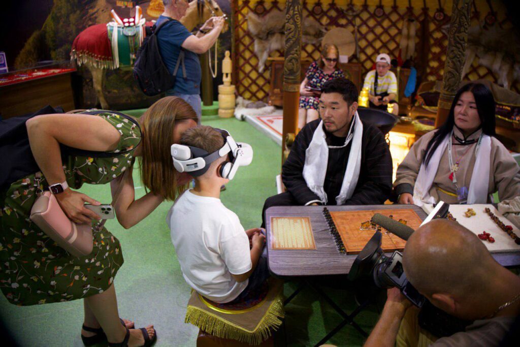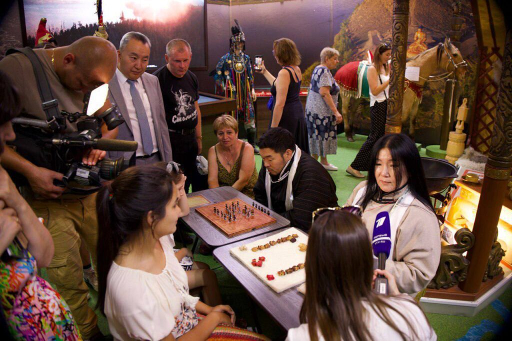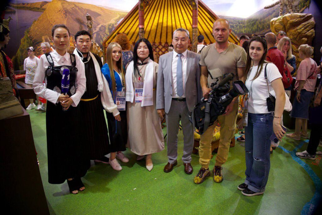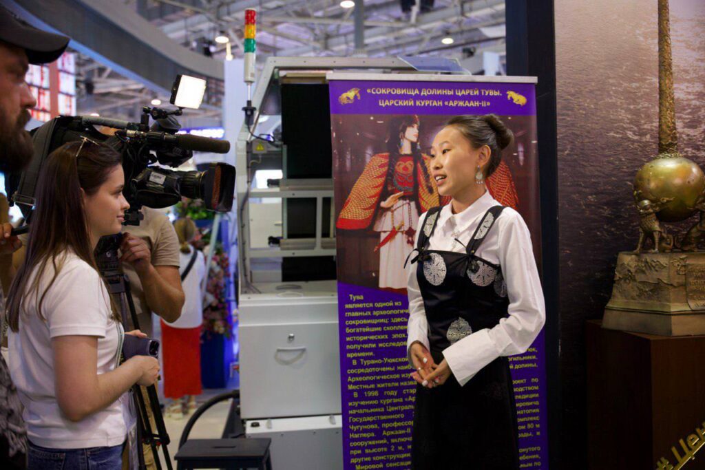 На стенде Тувы съемочную группу встретил Заместитель Председателя Правительства Республики Тыва — полномочный представитель Республики Тыва в г. Москве Чечен Чоксум.