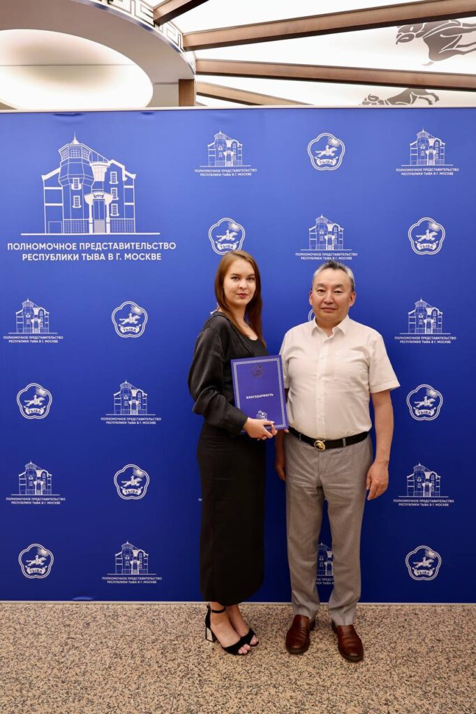 Заместитель Председателя Правительства Республики Тыва — полномочный представитель Республики Тыва в г. Москве Чечен Чоксум вручил благодарность продюсеру дирекции утреннего вещания Первого канала Анне Рябовой за освещение стенда Республики Тыва на Международной выставке-форуме «Россия».