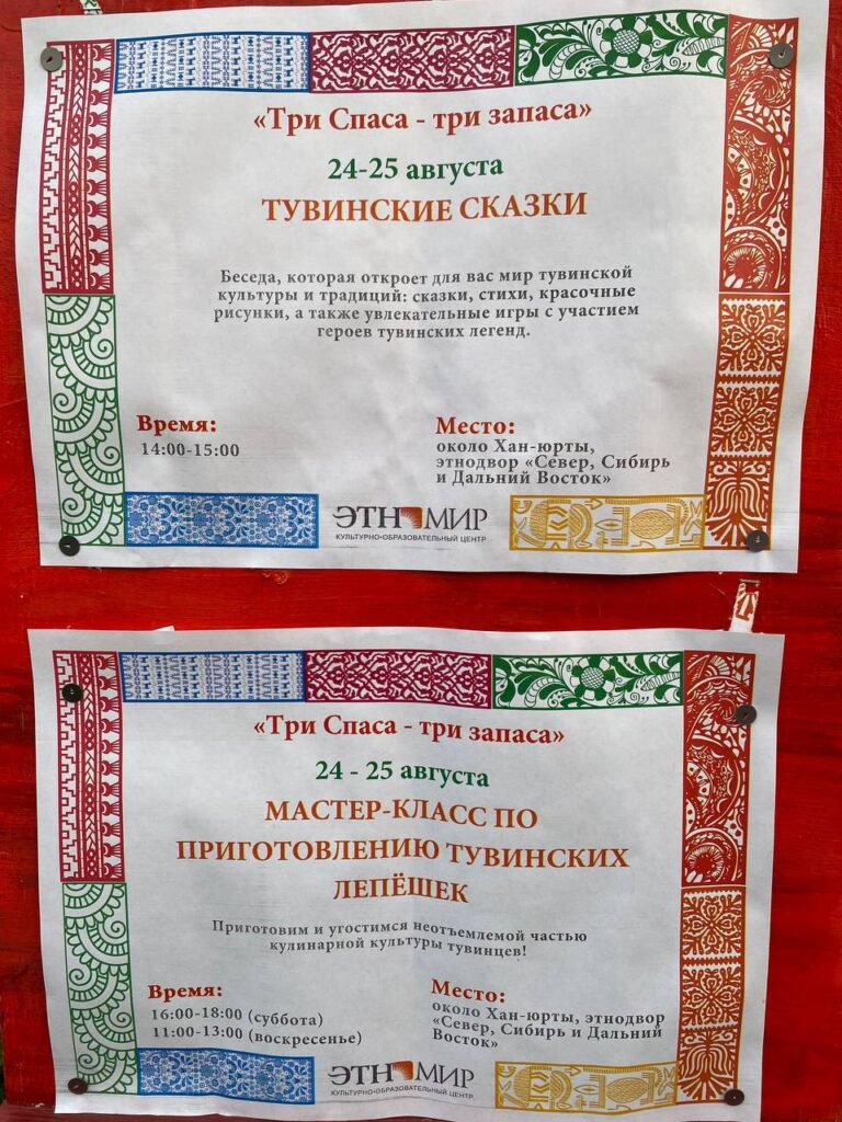 24-25 августа представители московского тувинского землячества приняли участие в мероприятии «Три Спаса — три запаса» в этнографическом музее-парке «Этномир» в Калужской области. Советник Полномочного представительства Республики Тыва в г. Москве Алла Знаменская и активисты землячества в течение двух дней проводили мастер-классы для ознакомлений гостей с тувинской культурой.