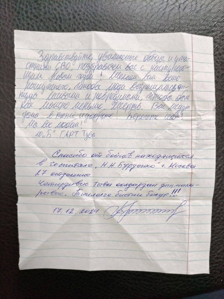 ️ Военнослужащему была передана посылка от подведомственных учреждений Министерства образования Тувы. В посылке для раненых были чаи, сиропы, средства личной гигиены и пр. вещи. Земляк был рад встрече с сотрудником Полпредства, а также тронут пожеланием в записке от учащего 10 «Б» класса Государственного лицея РТ. На той же записке от школьника военнослужащий написал ответ для него.